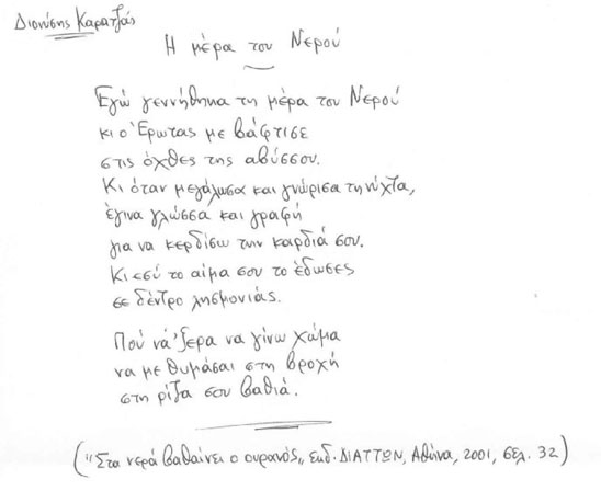 Πηγή: Τρίτο Πρόγραμμα, εκπομπή: ΕΒΔΟΜΑΔΕΣ ΕΛΛΗΝΩΝΠΟΙΗΤΩΝ, ΔΙΟΝΥΣΗΣ ΚΑΡΑΤΖΑΣ, που επιμελήθηκε και παρουσίασε ο Κώστας Φασουλάς.